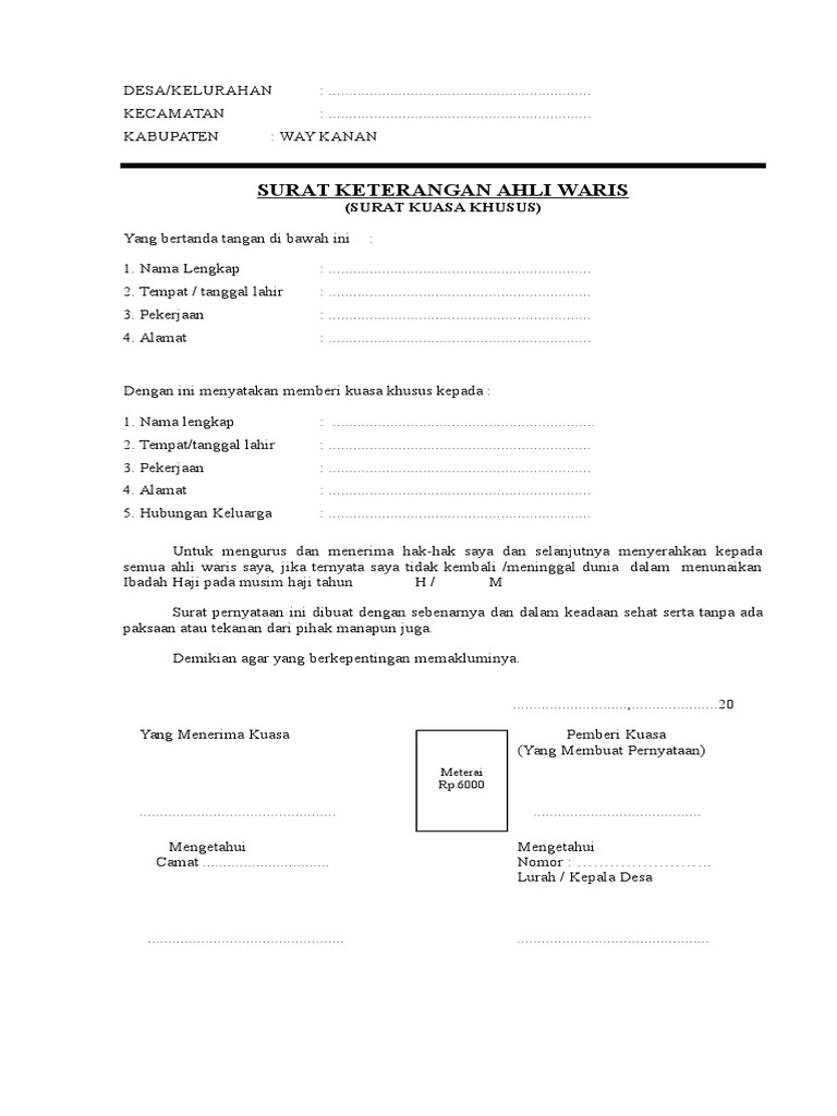 Surat kuasa ahli waris dibawah umur adalah surat yang diberikan oleh kelurahan kepada wali dari ahli waris yang masih di bawah umur. Surat ini memberikan hak kepada wali untuk mengurus segala keperluan ahli waris yang masih di bawah umur seperti menerima warisan, mengurus sertifikat tanah, dan lain-lain.